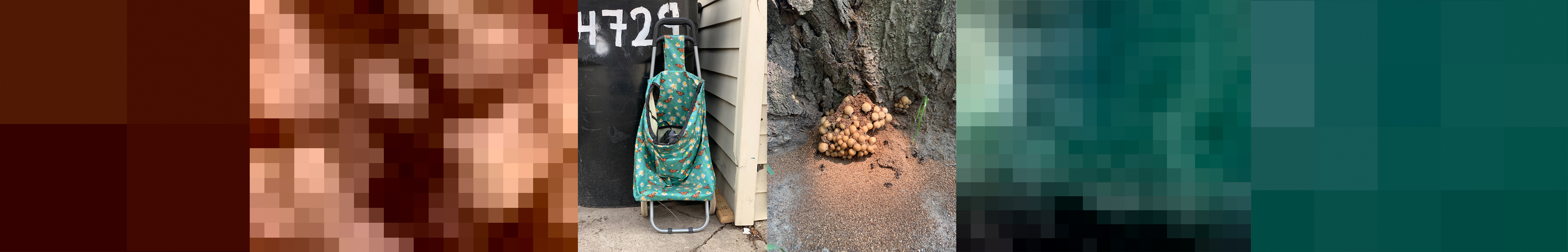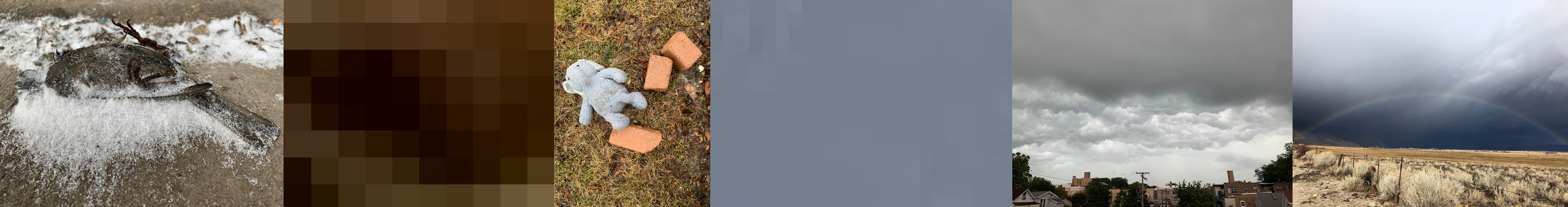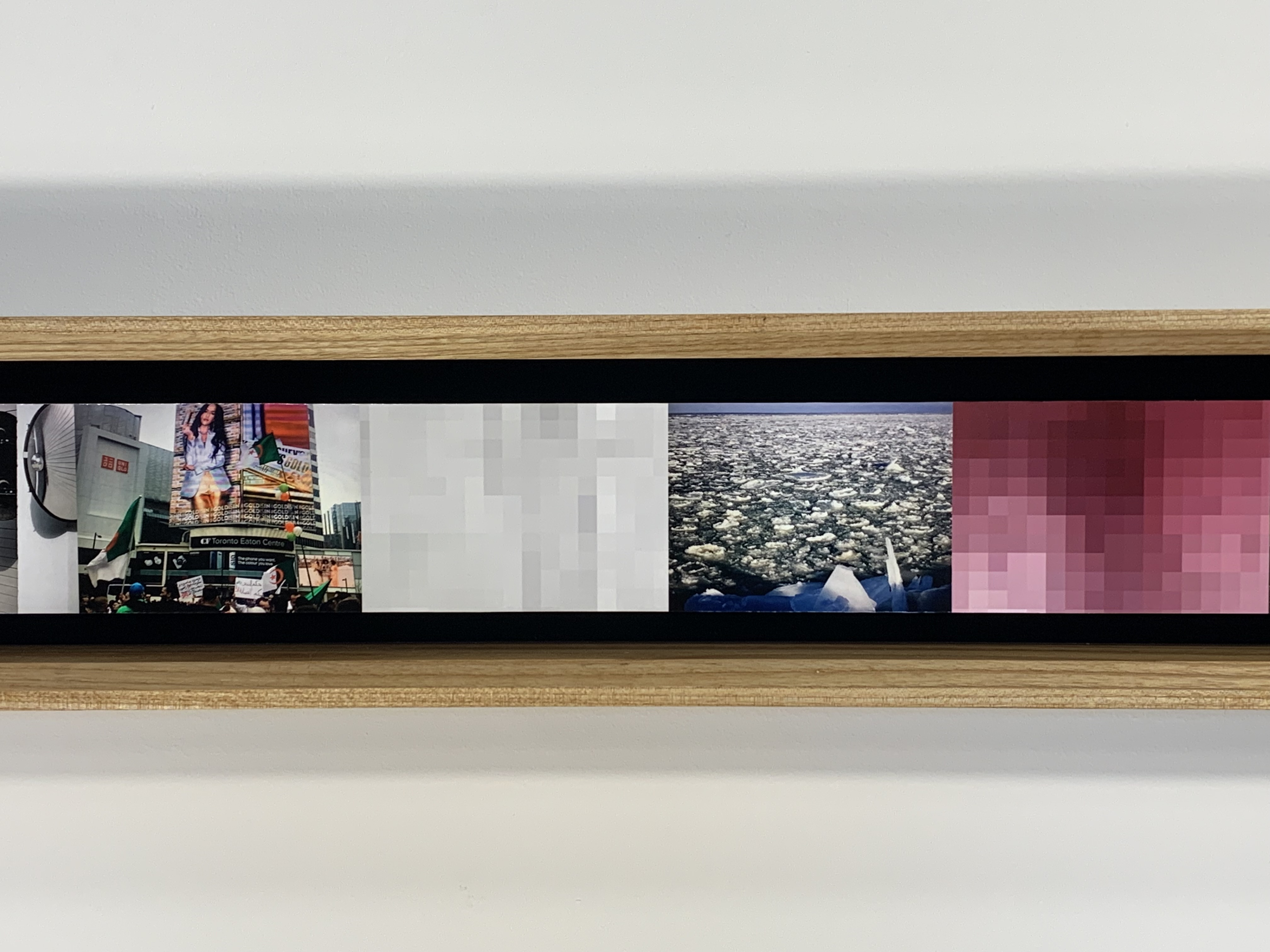 Among these captured moments are color field arrangements, extracted from the moments themselves. These arrangements of pixels, like a digital image’s cellular structure, are the exact geometric centers of each image of celebration and loss. Although we can zoom in so closely that what we are looking at sheds its original meaning, we cannot get any deeper than the literal flatness of the image itself. The viewer scans across the length of the piece, putting each image together, marking time. Zooming in while scanning across reflects the temporal disorientation I have experienced within grieving–the abruptness between a moment’s legibility giving way to abstractness.