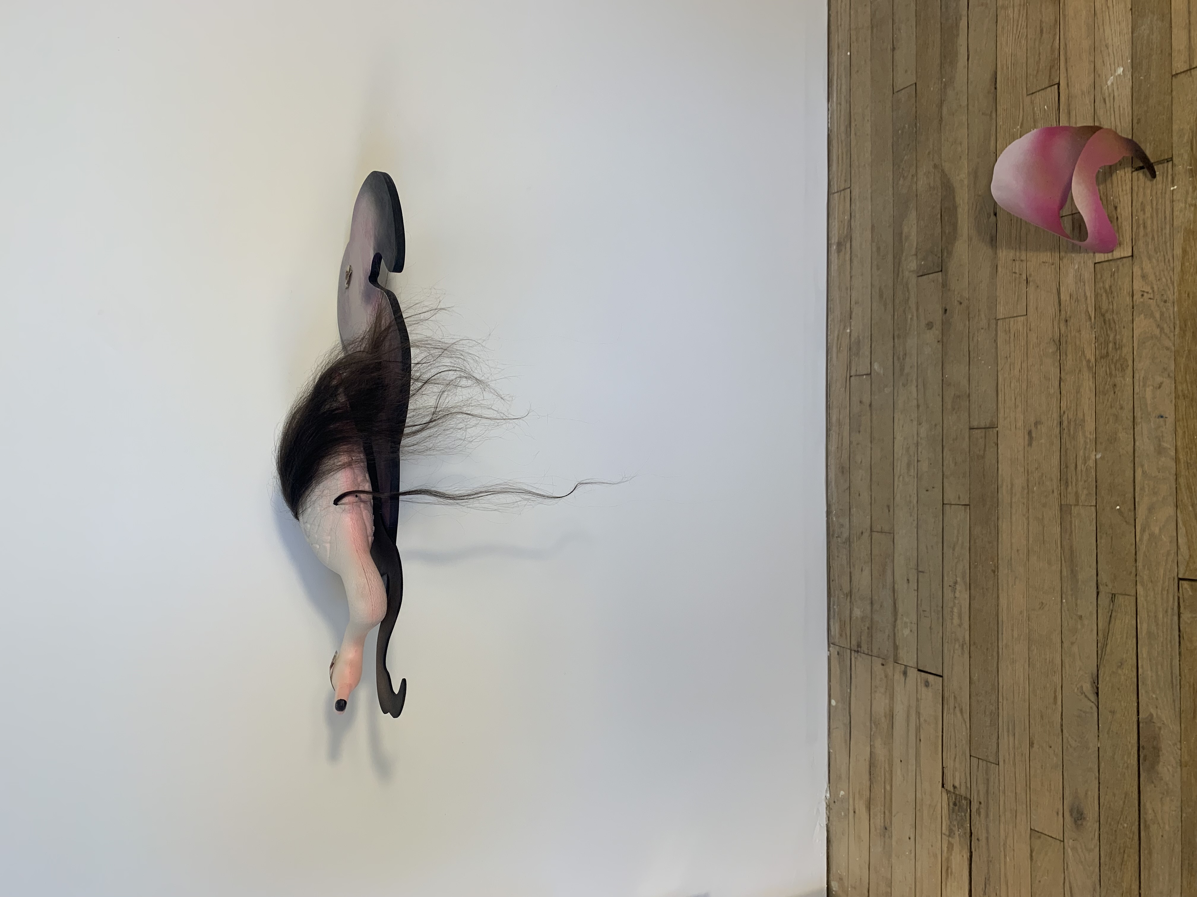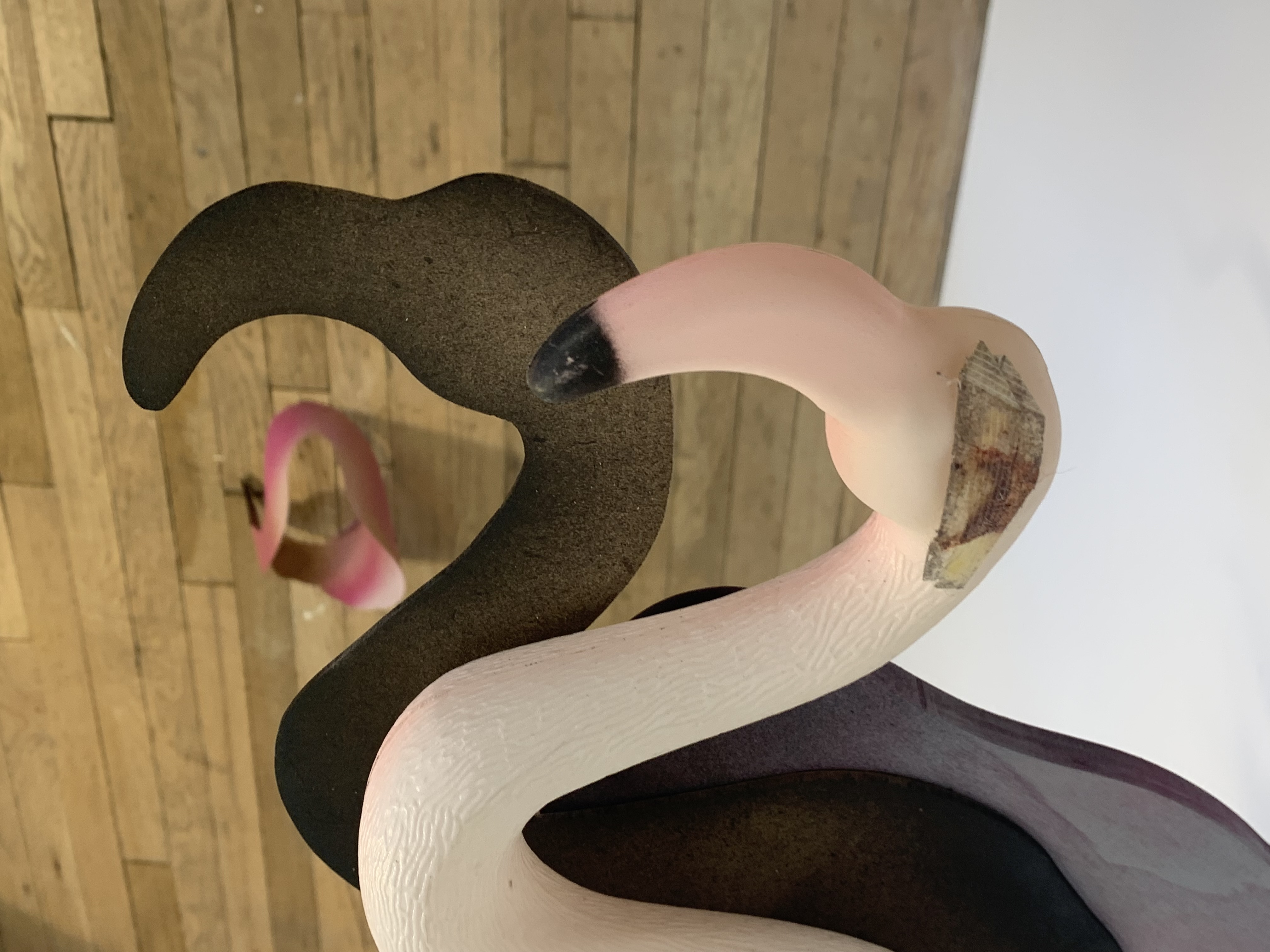 2026 | paper, wood, paint, hair, bandage, plastic flamingo